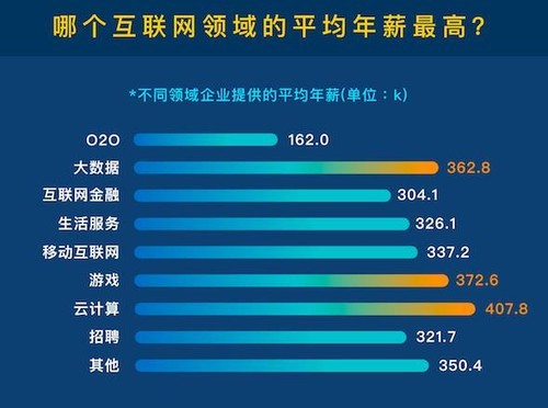 在互联网领域的平均薪资排行中,云计算、大数据和游戏稳居前三把交椅。其中云计算领域企业在100offer上发出的平均面邀年薪超过40万,游戏领域则受益于去年以来从《阴阳师》到《王者荣耀》的全民手游热,冲上了排名第二的位置。