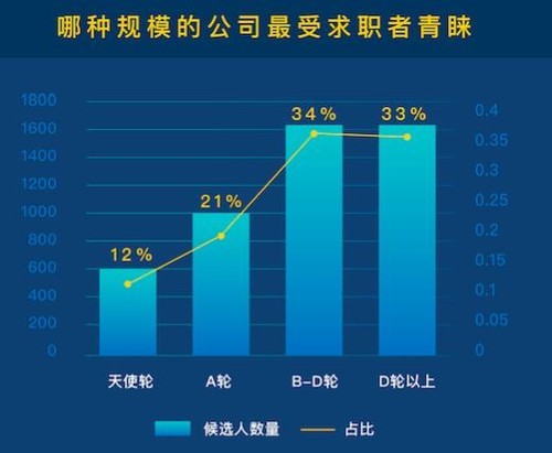在招聘市场上,B-D轮的中型企业与D轮以上的大公司对于求职者的吸引力几乎不相上下,分别占据了34%和33%。资本寒冬余波仍在,今年年后仍有部分包括乐视、易到用车等类型的中型公司接连倒闭,求职者在面对早期企业时显得慎重了许多,只有21%的候选人愿意考虑A轮公司,而对天使轮企业感兴趣的则仅有12%。