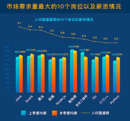 相比于 Q1,大多数互联网岗位的平均薪资均有不同程度提高。Java 工程师依然是市场上最抢手的岗位。Scala 和算法的需求量名列 2、3,显示了市场对于大数据领域旺盛的人才需求。