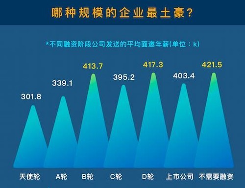 不需要融资的企业在100offer发送的平均面邀年薪最高,紧随其后依次是D轮、B轮以及上市公司。通常而言,无需融资或已上市的企业往往现金流充沛,运营也较为成熟。相比之下,初创企业的薪资则不占优势,资本寒冬余波下,创业公司倒闭潮使这些企业在人员配置上的花费变得更加谨慎。