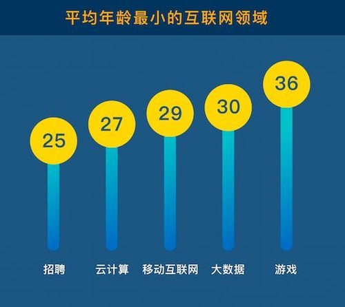 招聘行业成了年轻人最多的互联网领域,而云计算、移动互联网等领域由于需要较高的学历背景及工作经验,候选人年纪多在30岁上下。相对收入较高的游戏行业,其在100offer平台上招聘的平均入职年龄则达到36岁左右。